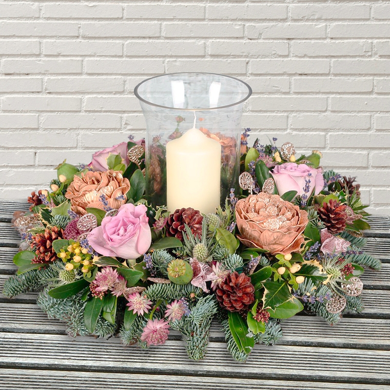 A lilac and gold table arrangement with hurricane vase and candle in the centre. Artificial gold glittery rose, lilac roses, dried lavender, white thistles, cream hypericum, pink astrantia, pines cones and glittery gold swirls. Festive foliage.