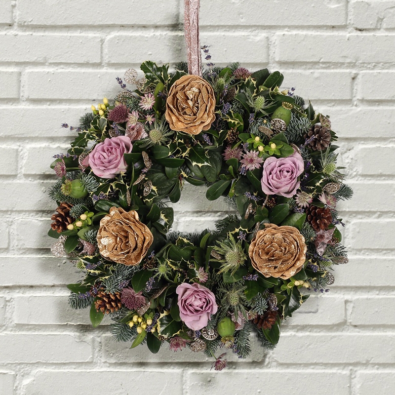 Glitzy artificial gold roses, lilac roses, dried lavender, white thistles, cream hypericum, pink astrantia, pines cones and glittery gold swirls. Festive foliage.