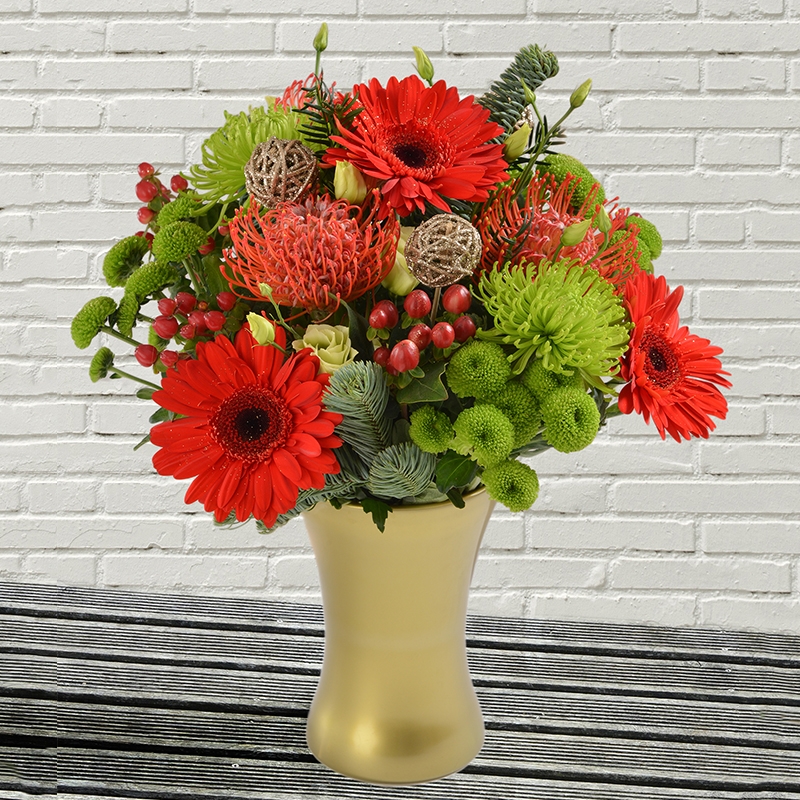 A mix of red and green flowers make up this beautiful festive hand tied bouquet.