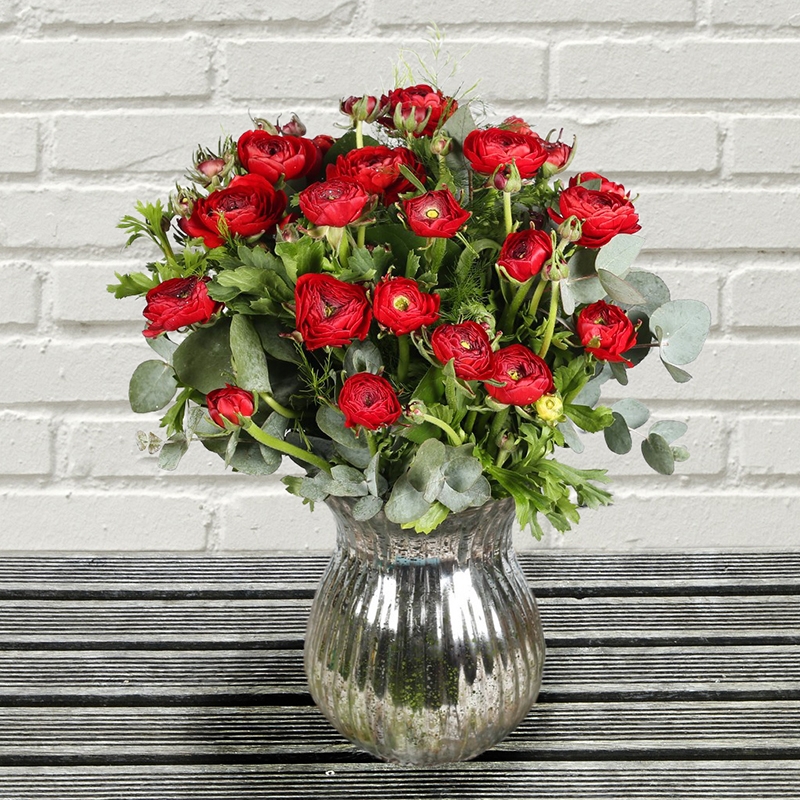 A vibrant Red Ranunculus hand tied with seasonal foliage in a silver crackled vase. Sprinkled with subtle white glitter.